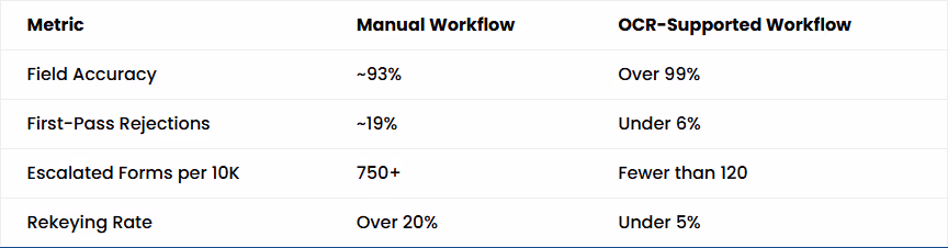 None of this matters unless the system can process these forms without letting error rates creep up. Real performance is not about how fast documents move. It’s about maintaining form accuracy and field compliance at scale.